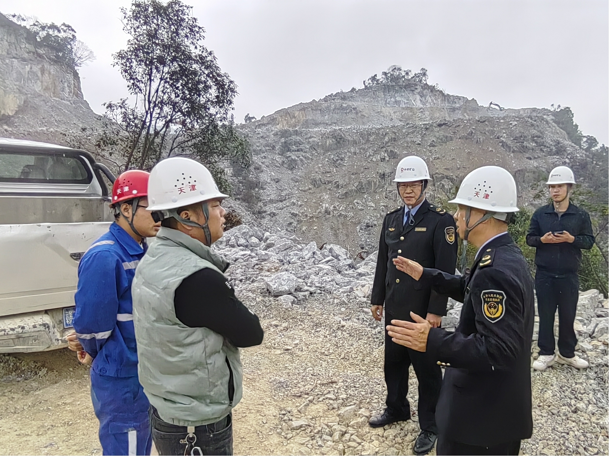 2023年12月14日下午13:00,都安上峰水泥有限公司黃總陪同都安縣應(yīng)急管理局唐局長(zhǎng)、藍(lán)局長(zhǎng)等領(lǐng)導(dǎo)蒞臨都安上峰水泥加后礦區(qū)灰?guī)r礦現(xiàn)場(chǎng)檢查指導(dǎo)工作。